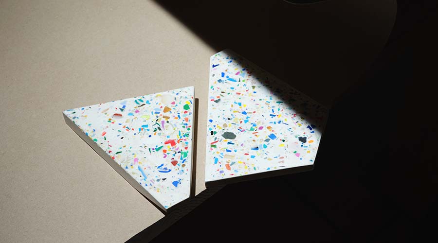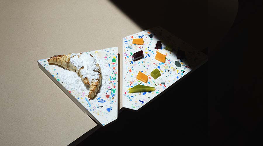 Moseanic Dine je set dveh barvitih ergonomsko oblikovanih geometričnih plošč, ki ju lahko postavljamo v poljubne kompozicije. Pogrinjek je ročno izdelan iz lokalno pridobljene mineralne zmesi in delcev naplavljene mikro in makro plastike, ki smo jo nabrali na obalah Jadranskega morja.