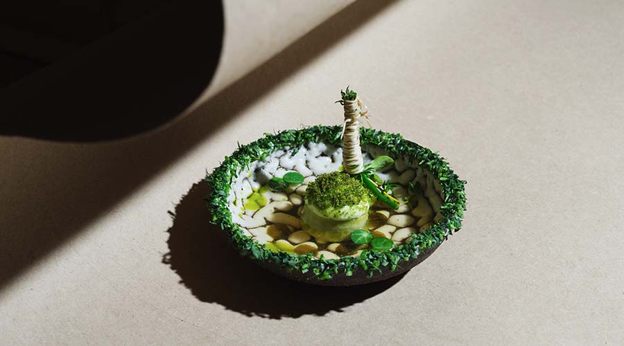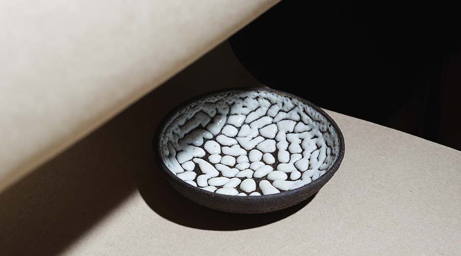 Pogrinjek sestavljata dva ločena kosa – krožnik iz črne kamenine, ki je v notranjosti prekrit s svetlečo belo glazuro in izdelan na lončarskem vretenu, ter manjši kos v obliki rečnega kamna, ki je ročno oblikovan iz mešanice dveh glin – črne šamotirane kamenine in bele gline. Oba kosa sta žgana v električni peči na 1230 °C.
